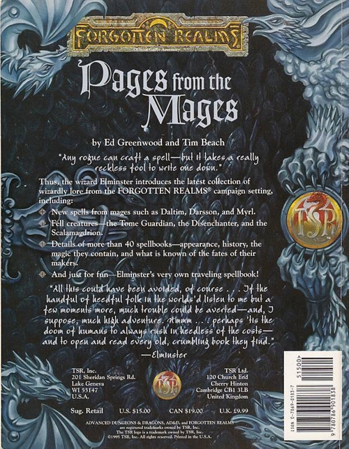 Advanced Dungeons & Dragons 2nd Edition Forgotten Realms Pages From the Mages. Any Rogue can craft a spell but it takes a fool to write one down. This book is a paperback in 128 magical pages. First Released in 1995.