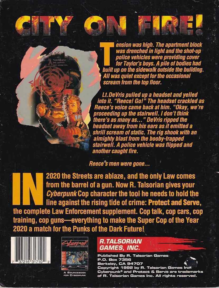 In CP2020 - Protect & Serve, the Streets are ablaze, and the only Law comes from the barrel of a gun. Now R.Talsorian gives your hard fighting cops of the cyberpunk world the tools they need to hold the Line against the rising tide of crime: Protect and Serve - CP2020, the complete Law Enforcement supplement. Cop talk, cop cars, cop training, cop guns - everything your Super Cop of the Year 2020 a match for the Punks of the Dark Future!