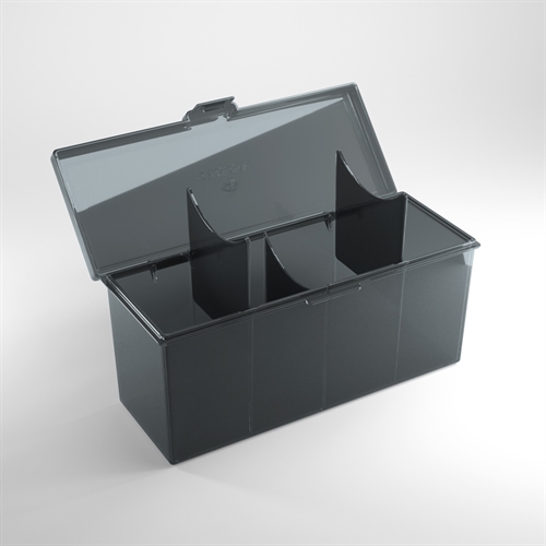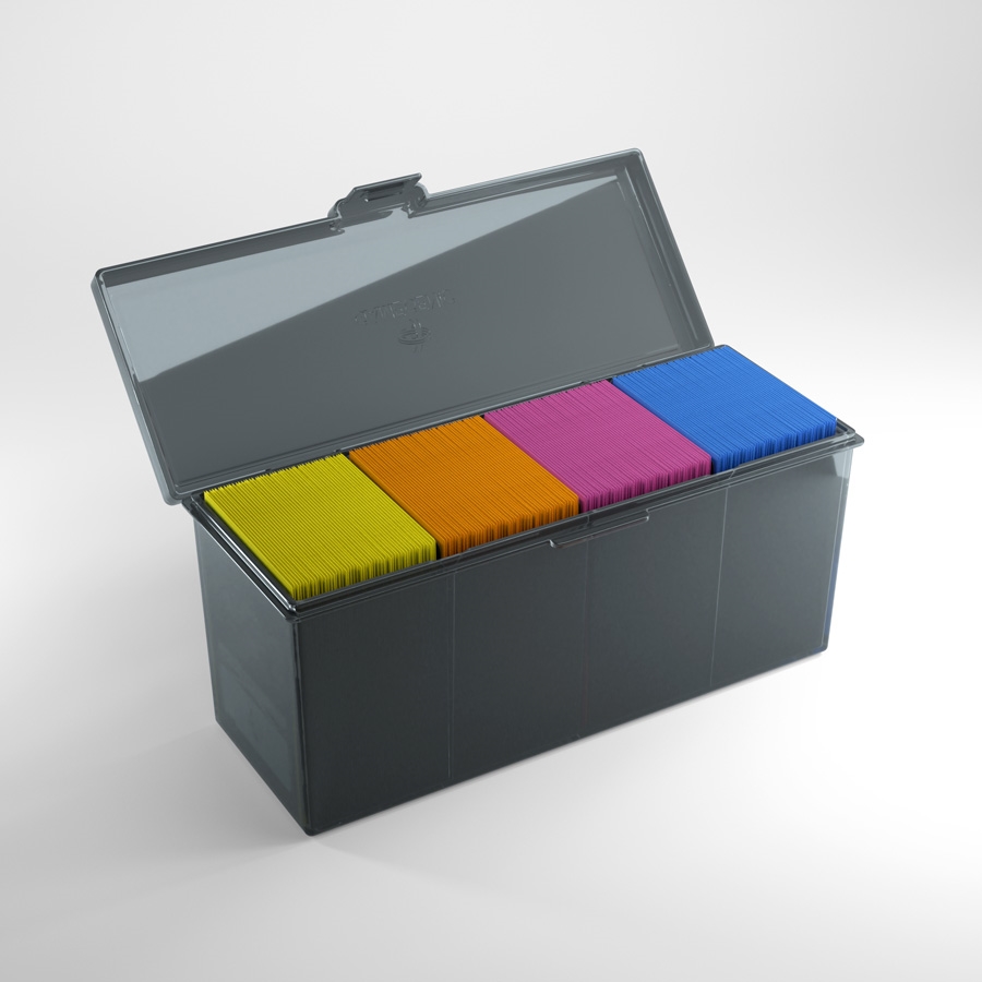 Full decks, dice, tokens or 320 double-sleeved cards: there is a lot that the Fourtress can hold and protect! This sturdy box is available in 5 different semi-transparent colors, allowing its contents to be easily identified. The integrated lock keeps it safely closed, while two inner walls can be removed to create bigger compartments. The boxes are stackable, so they are both perfect travel companions and a great storage solution at home.