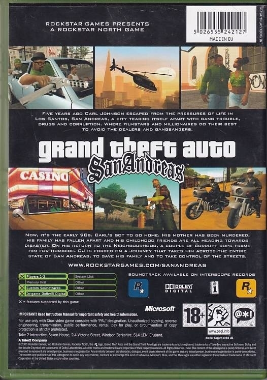 • Used Grand Theft Auto San Andreas for XBOX comes with cover and manual.