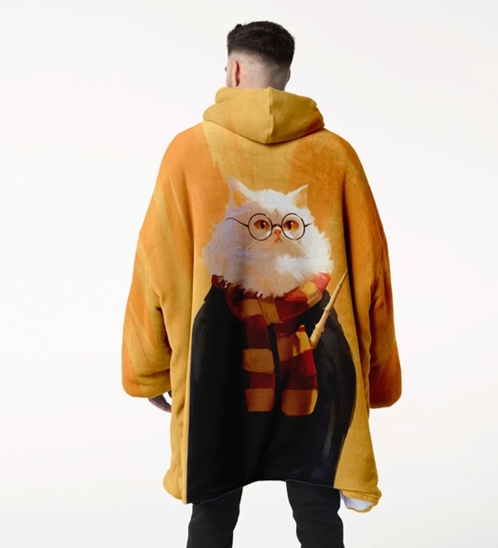 Prepare to step into a world of ultimate coziness and magic. The Huggie - Wizard Kitten - Giant Blanket Hoodie is not just a piece of clothing; it is your new personal sanctuary, combining the warmth of a giant blanket with the freedom of movement of a hoodie. Featuring a unique print of an adorable white "Wizard Kitten," complete with glasses, a magic wand, and the classic red-and-yellow scarf, this Huggie brings a touch of enchantment to every relaxed moment at home.