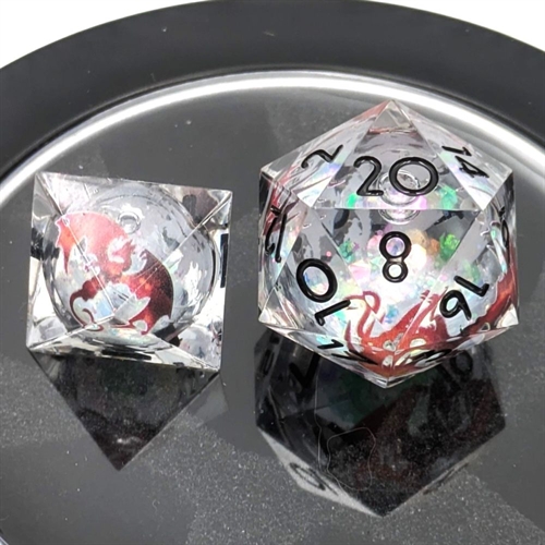 These clear, transparent Liquid Core Dice with black numbers, red dragons, and white glitter are absolutely mesmerizing. The shimmering glitter inside swirls beautifully when you roll the die, so even a Nat 1 turns into a tiny glitter party.