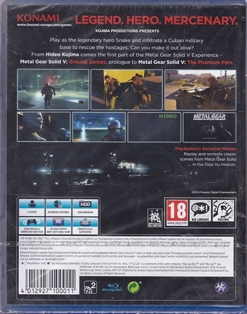 • Used Metal Gear Solid V Ground Zeroes for PS4 comes with cover and manual.