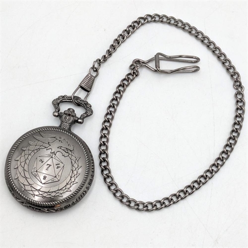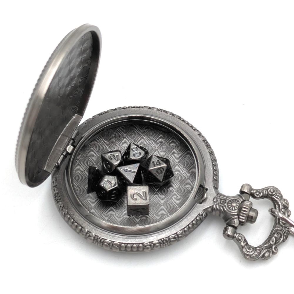 These mini metal dice are super cool and add a touch of style to your roleplaying game! The dice measure between 6mm and 8mm; large enough to clearly read your rolls, yet small enough to fit perfectly inside the pocket‑watch holder. With a press of the button, the case opens just like a real pocket watch, letting you take out your tiny dice and roll for your character.