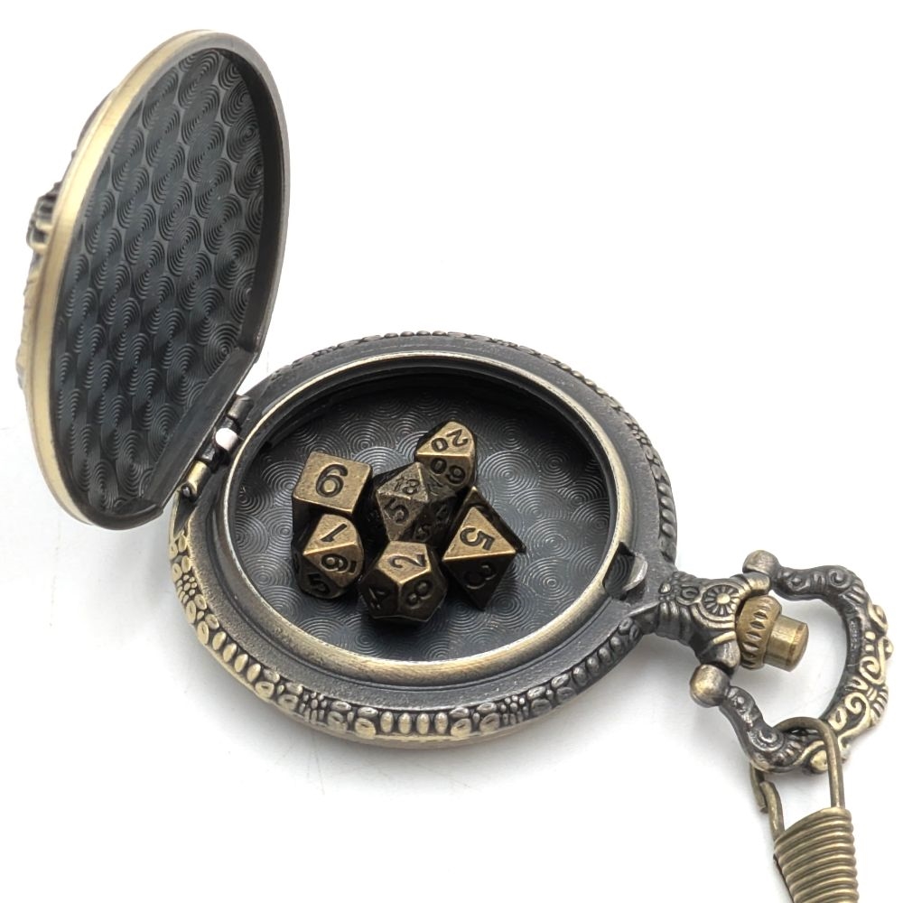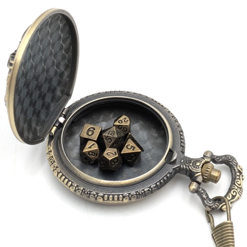 These mini metal dice are super cool and add a touch of style to your roleplaying game! The dice measure between 6mm and 8mm; large enough to clearly read your rolls, yet small enough to fit perfectly inside the pocket‑watch holder. With a press of the button, the case opens just like a real pocket watch, letting you take out your tiny dice and roll for your character.