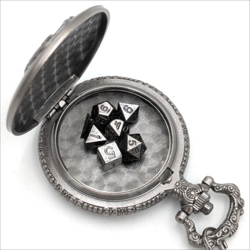 These mini metal dice are super cool and add a touch of style to your roleplaying game! The dice measure between 6mm and 8mm; large enough to clearly read your rolls, yet small enough to fit perfectly inside the pocket‑watch holder. With a press of the button, the case opens just like a real pocket watch, letting you take out your tiny dice and roll for your character.