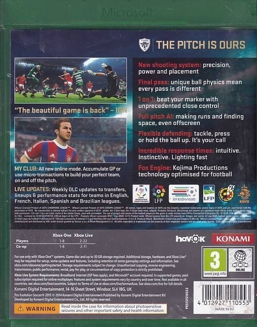 • Used Pro Evolution Soccer 2015 for XBOX ONE comes with cover.