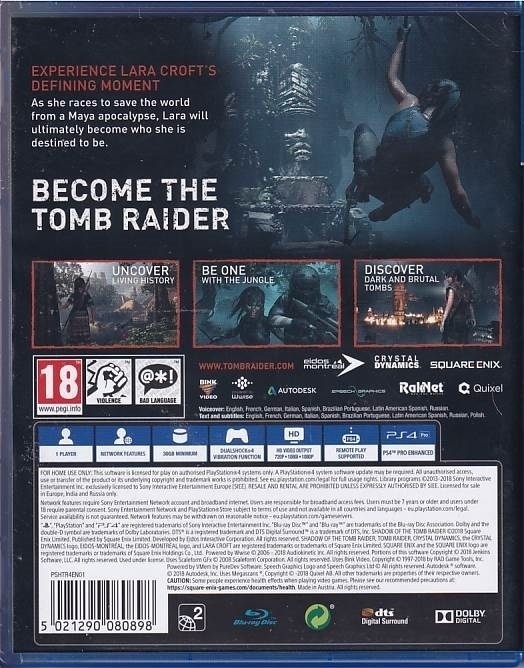 • Used Shadow of the Tomb Raider for PS4 comes with cover and manual.