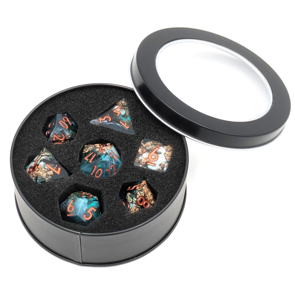 These Emerald cloudy swirl dice with gold flakes are absolutely stunning and bring a touch of elegance to your roleplaying table! Perfect for players who want a little extra flair when the dice start rolling.