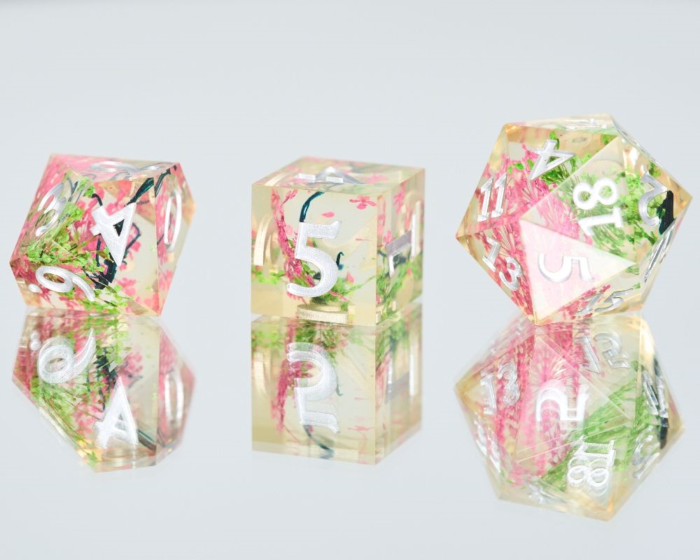 Sharp Edge Resin Dice Set - Pink Flower - Metal RPG Dice - Epic Dwarf Dice
