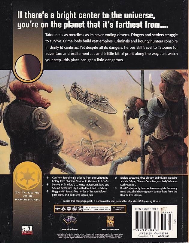 Tatooine is as merciless as its never-ending deserts. In the Secrets of Tatooine - Campaign Pack for Star Wars RPG d20, fringers and settlers struggle to survive. Crime lords build vast empires. Criminals and bounty hunters conspire in dimly lit cantinas. Yet despite all its dangers, heroes still travel to Tatooine for adventure and excitement... and a little bit of profit along the way. Just watch your step - this place can get a little dangerous.