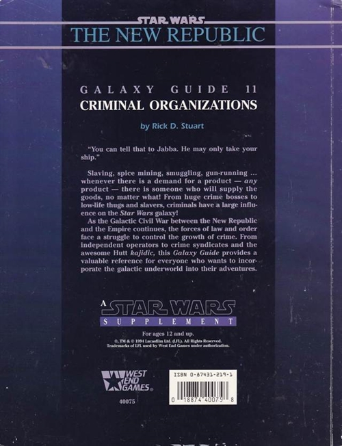 As the Galactic Civil War between the New Republic and the Empire continues, the forces of law and order face a struggle to control the growth of crime. From independent operators to crime syndicates and the awesome Hutt kajidic, this Galaxy Guide provides a valuable reference for everyone who wants to incorporate the galactic underworld into their adventures.