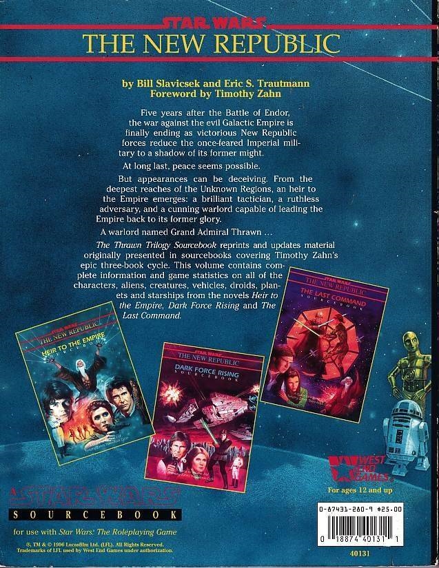 The Thrawn Trilogy Sourcebook reprints and updates material originally presented in sourcebooks covering Timothy Zahn's epic three-book cycle. Star Wars RPG - The Thrawn Trilogy Sourcebook contains complete information and game statistics on all of the characters, aliens, creatures, vehicles, droids, planets and starships from the novels Heir to the Empire, Dark Force Rising and The Last Command.