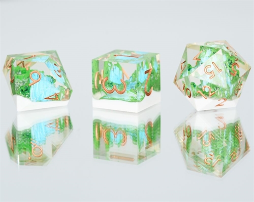 These clear dice with a Green Stone Mountain and river inside are absolutely stunning and bring a touch of elegance to your roleplaying table! Perfect for players who want a little extra flair when the dice start rolling.