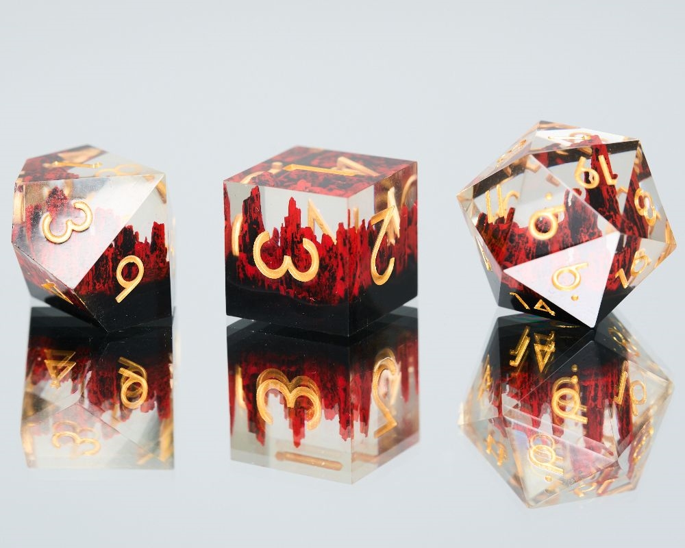 These clear dice with a Red Stone Mountain inside are absolutely stunning and bring a touch of elegance to your roleplaying table! Perfect for players who want a little extra flair when the dice start rolling.