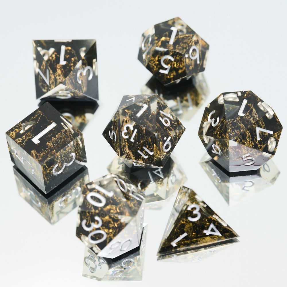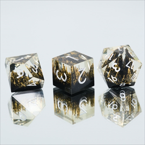 These clear dice with a Golden Stone Mountain inside are absolutely stunning and bring a touch of elegance to your roleplaying table! Perfect for players who want a little extra flair when the dice start rolling.