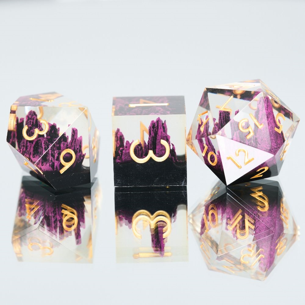 These clear dice with a Purple Stone Mountain inside are absolutely stunning and bring a touch of elegance to your roleplaying table! Perfect for players who want a little extra flair when the dice start rolling.