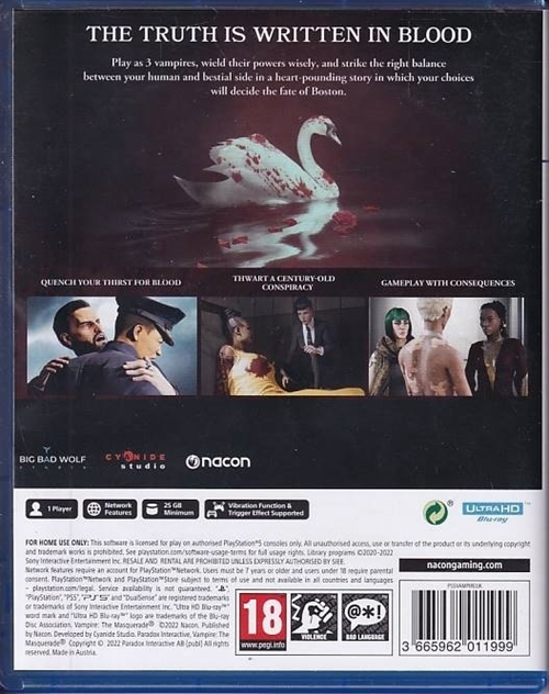 • Used Vampire the Masquerade Swansong for PS5 comes with cover and manual.